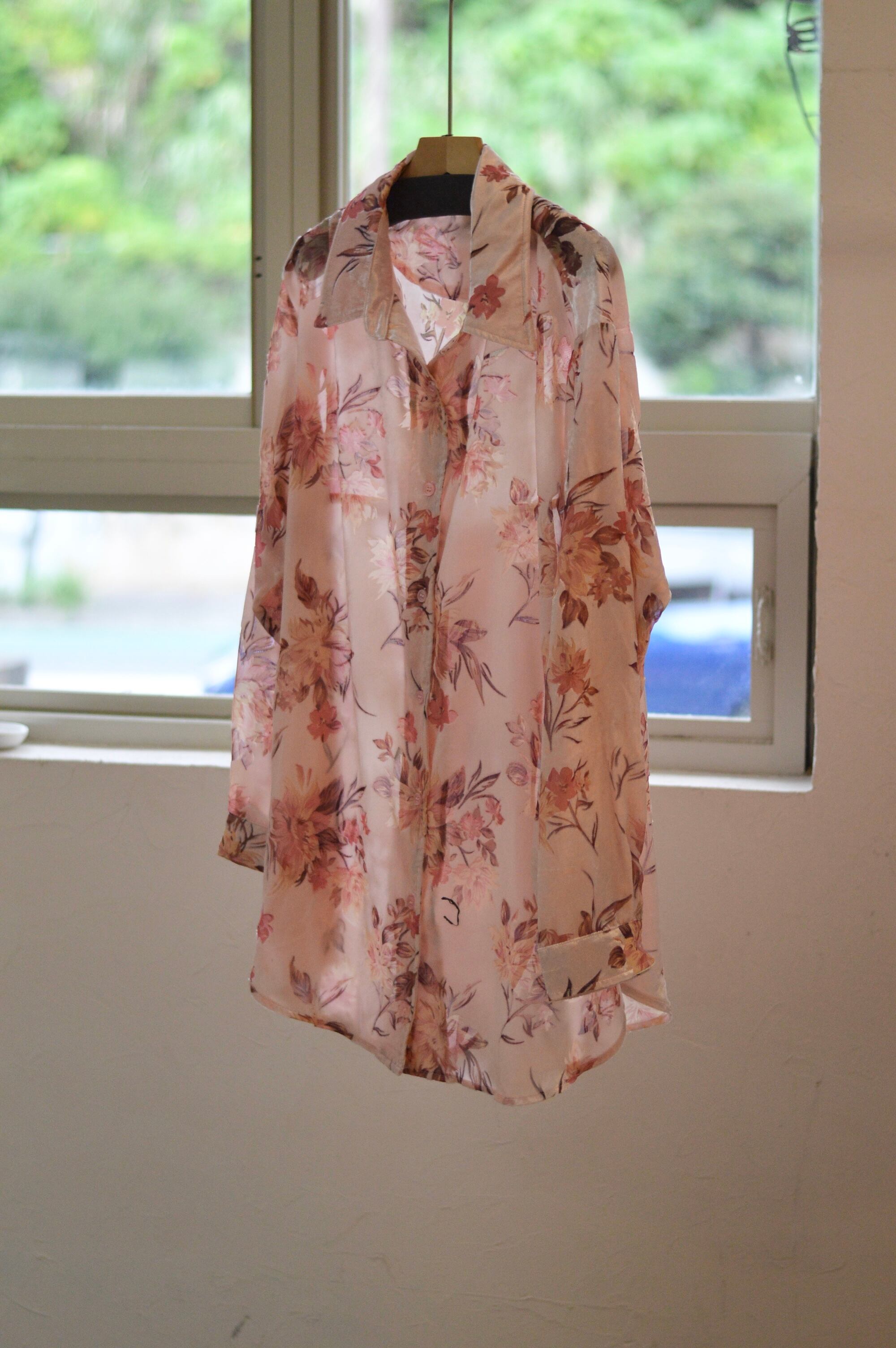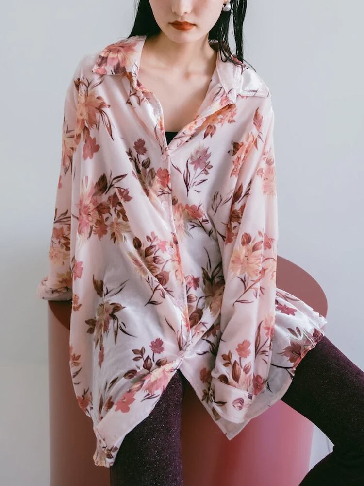 滑らかなベロア素材に花模様のオパール加工が施されたベロアシャツ。