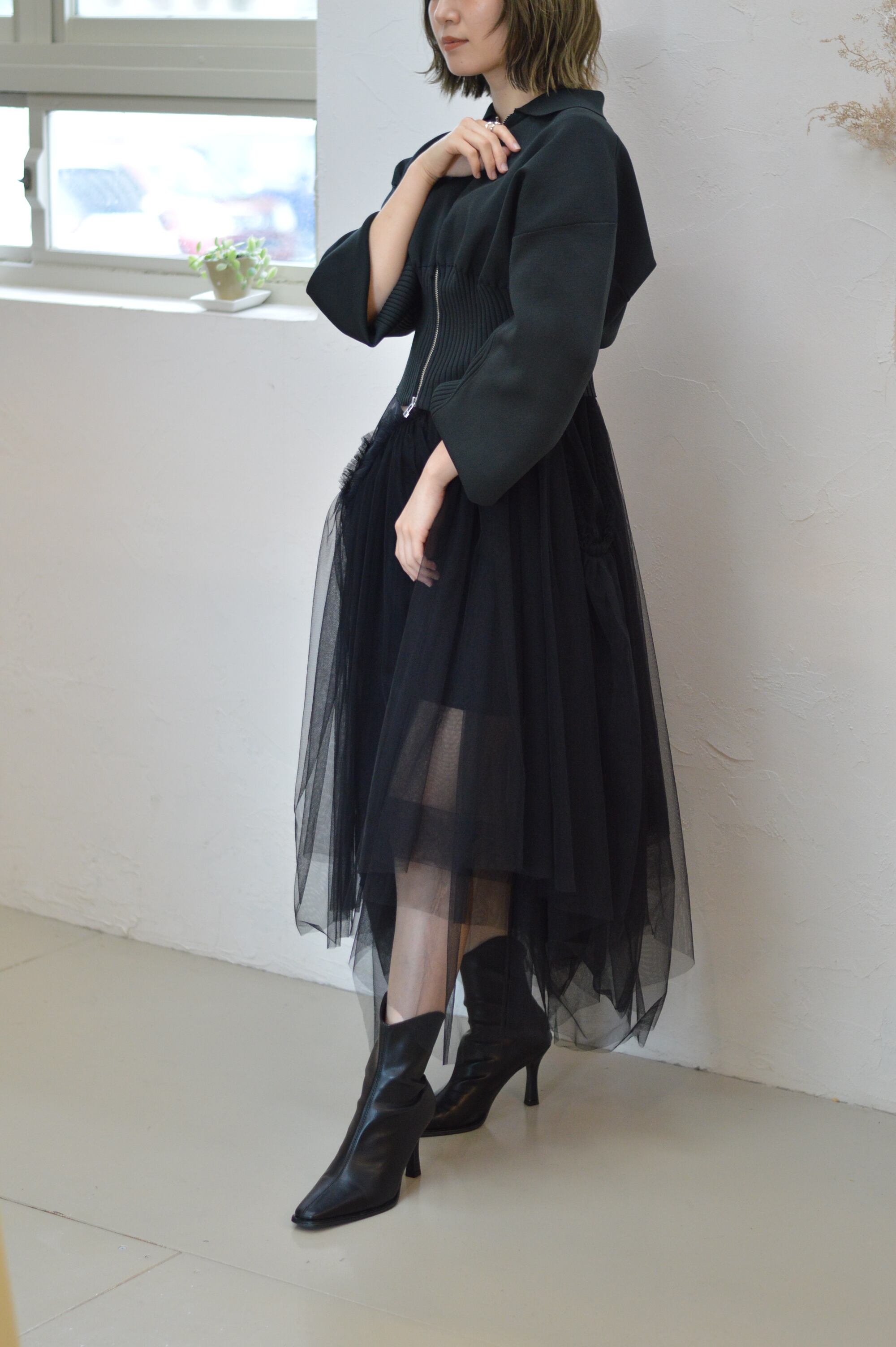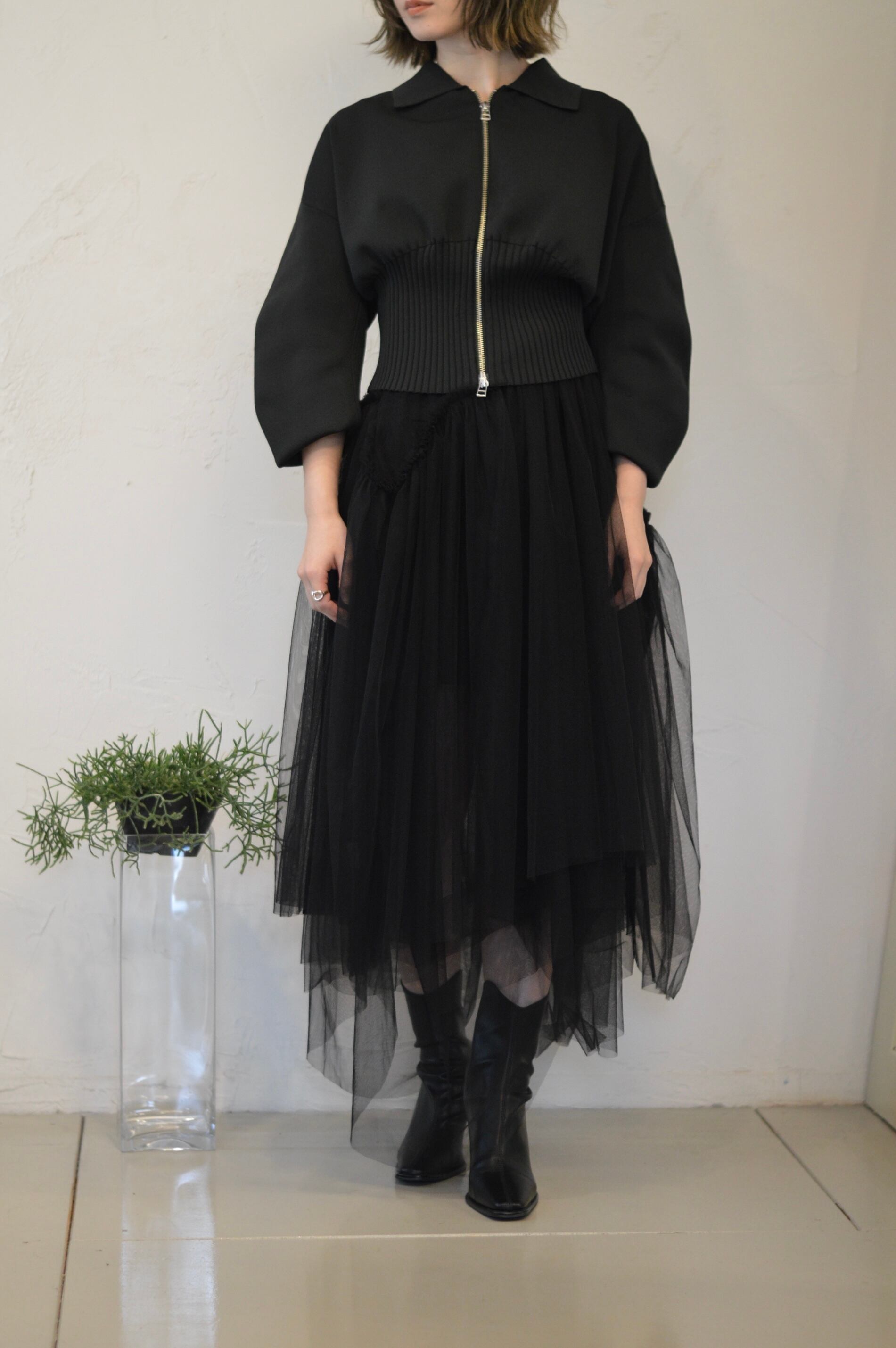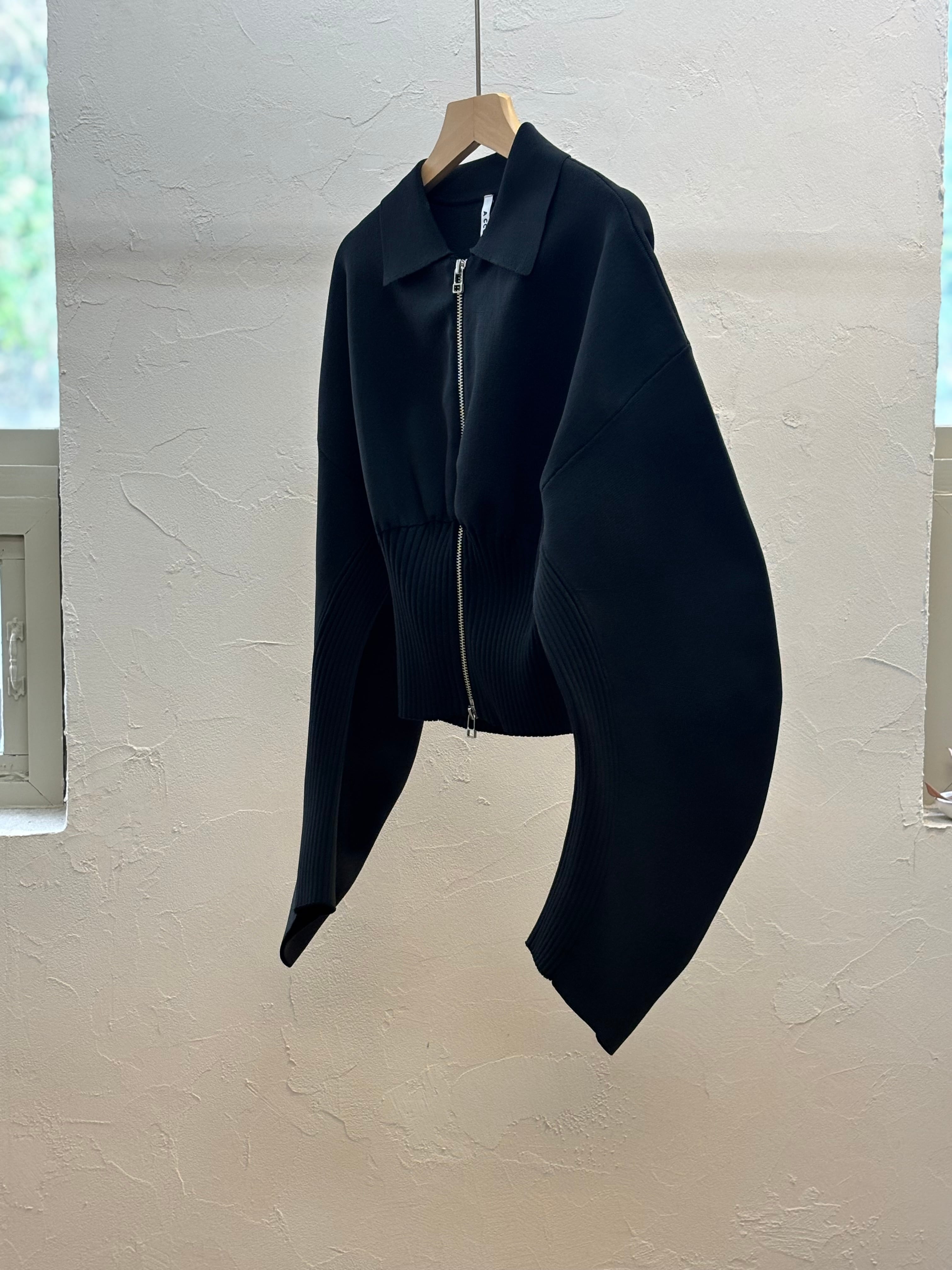 カーブした袖のラインに袖下リブ切替が着用時のニュアンスを演出。 アレンジが楽しめる逆開ジッパー仕様です。