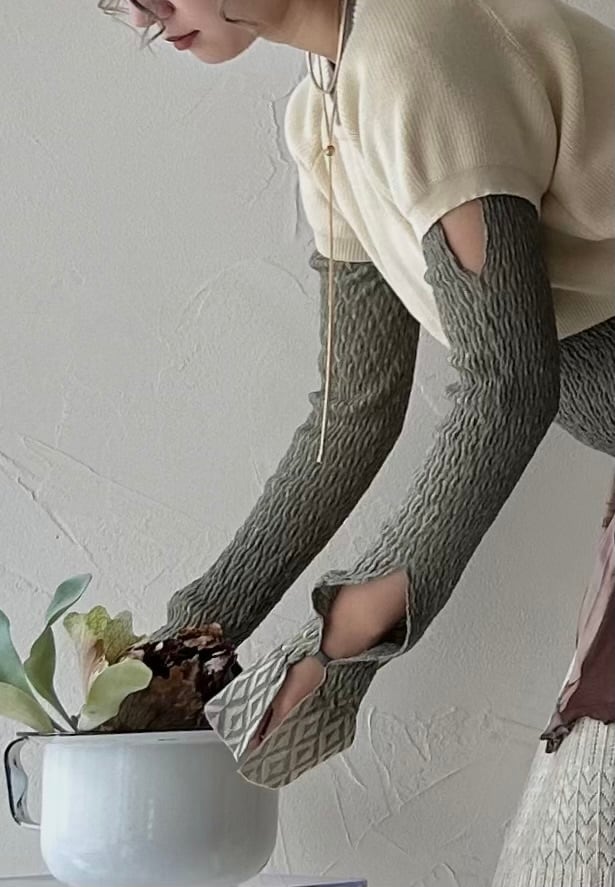 2色の糸を表と裏で色分けするプレーティング技法と立体感の出るリンクス編みで表現しています。