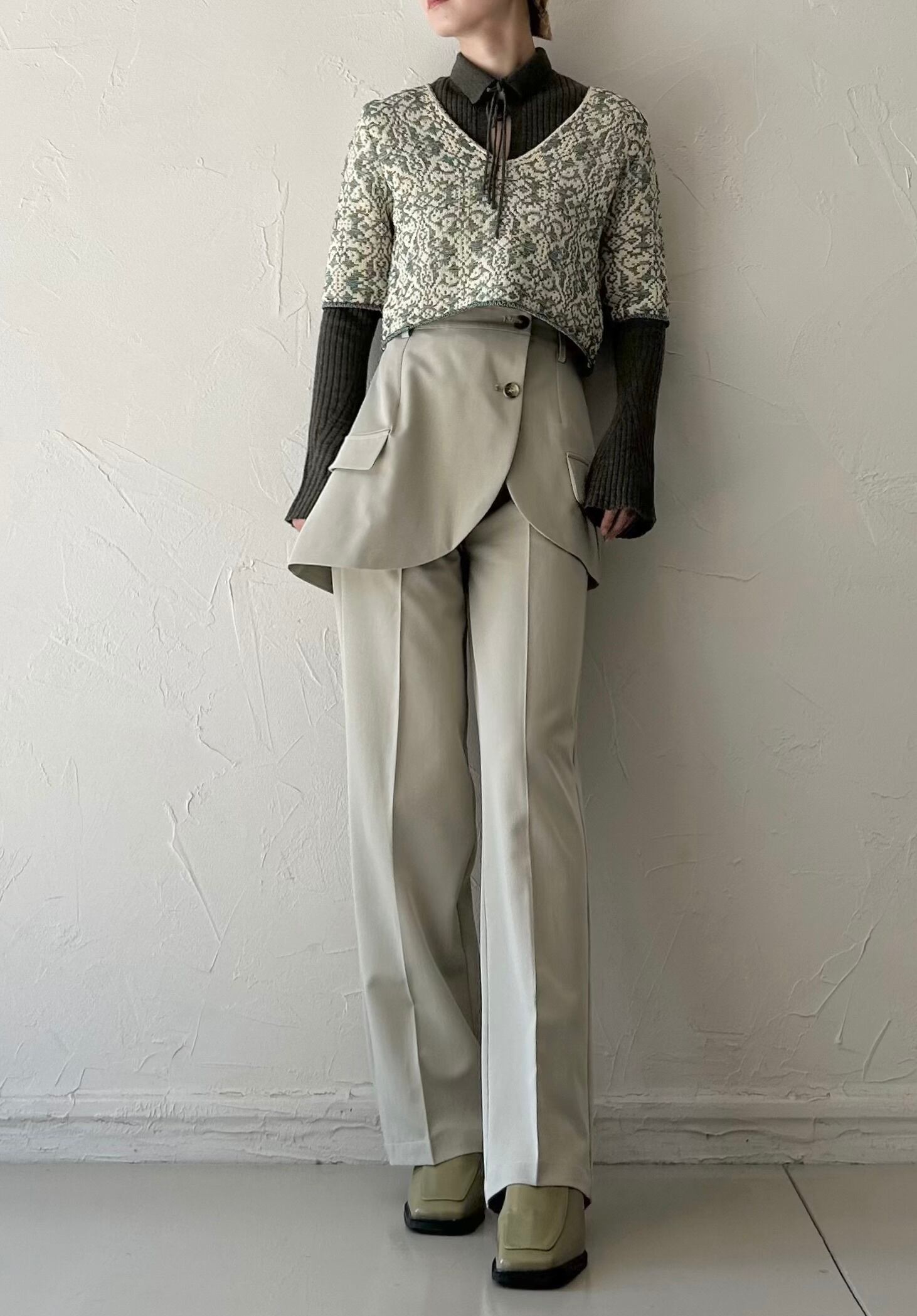 カーブになったウエストフロントに、細いゴムシャーリングベルトを合わせたデザイン。裾部分に入れたフロントのロングスリットもポイントです。