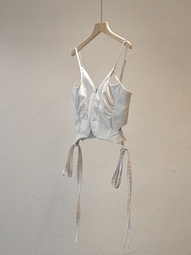 生地の表面にカレンダー加工を施し、レザーのような質感と表情に仕上げたヘヴィーウエイトサテンのビスチェ。