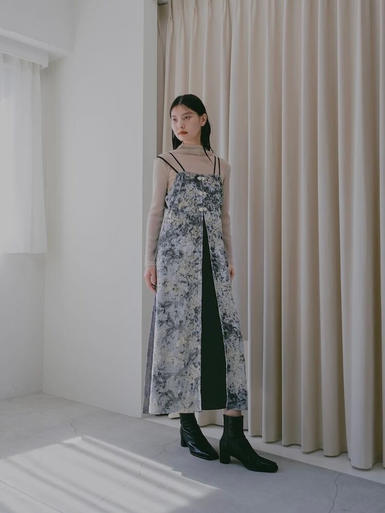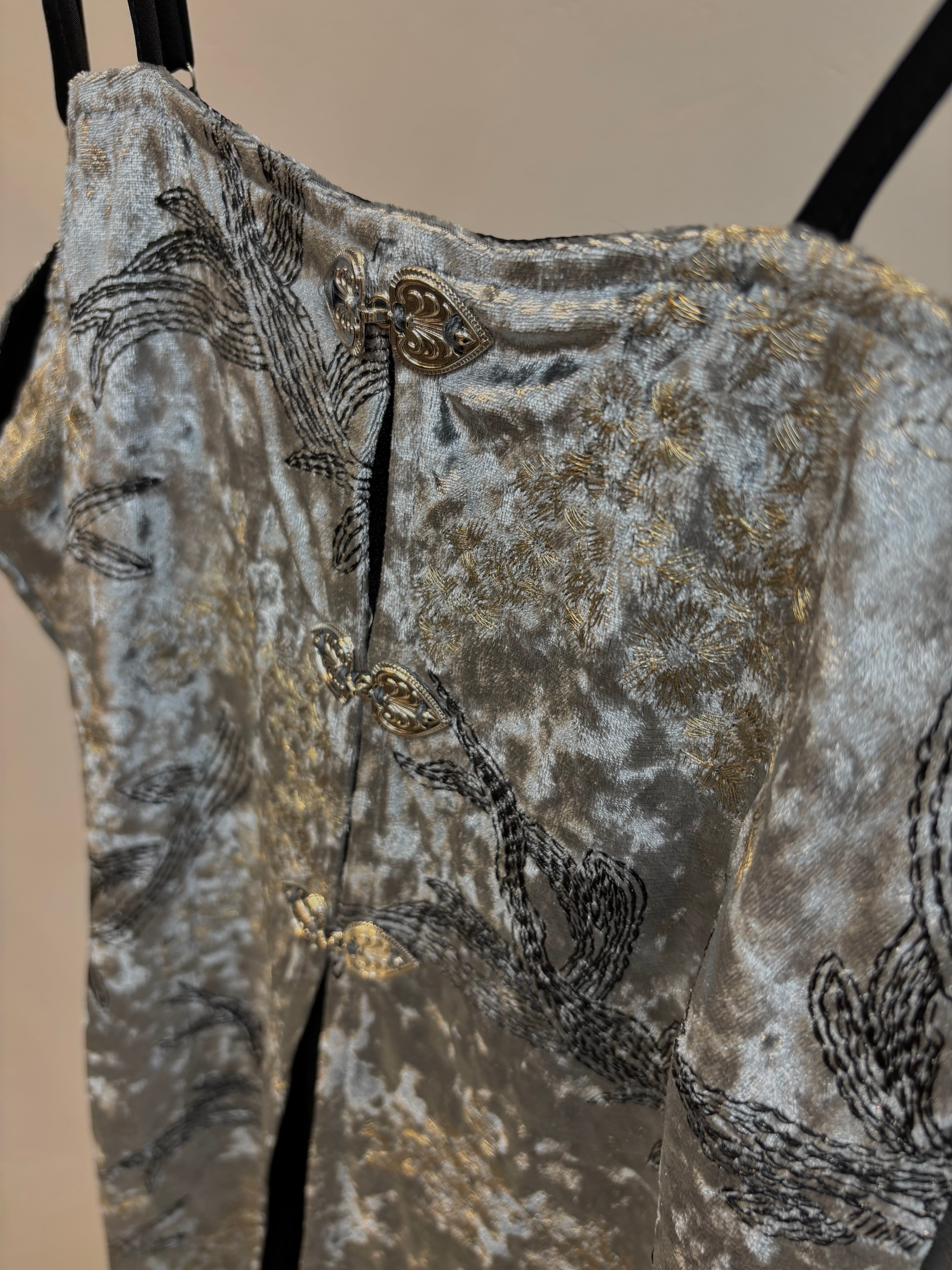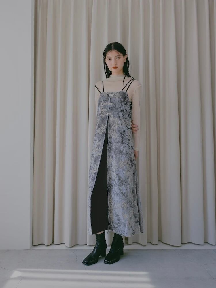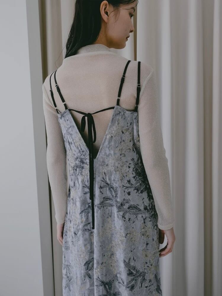 艶やかなベロア素材に、ラメ糸で花模様の刺繍を施したキャミソールドレス。