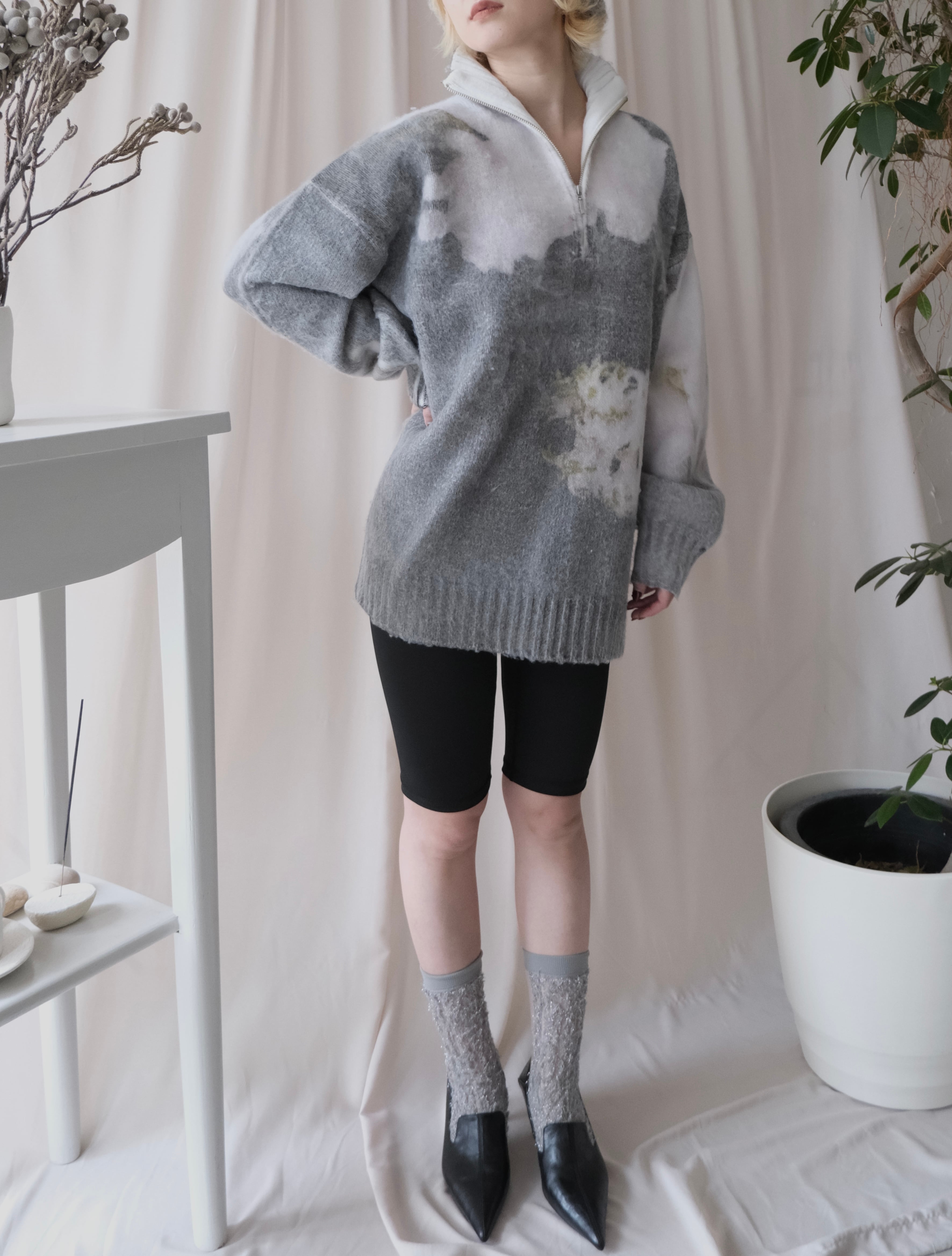 Flower Print Half Zip Knit / GRAY