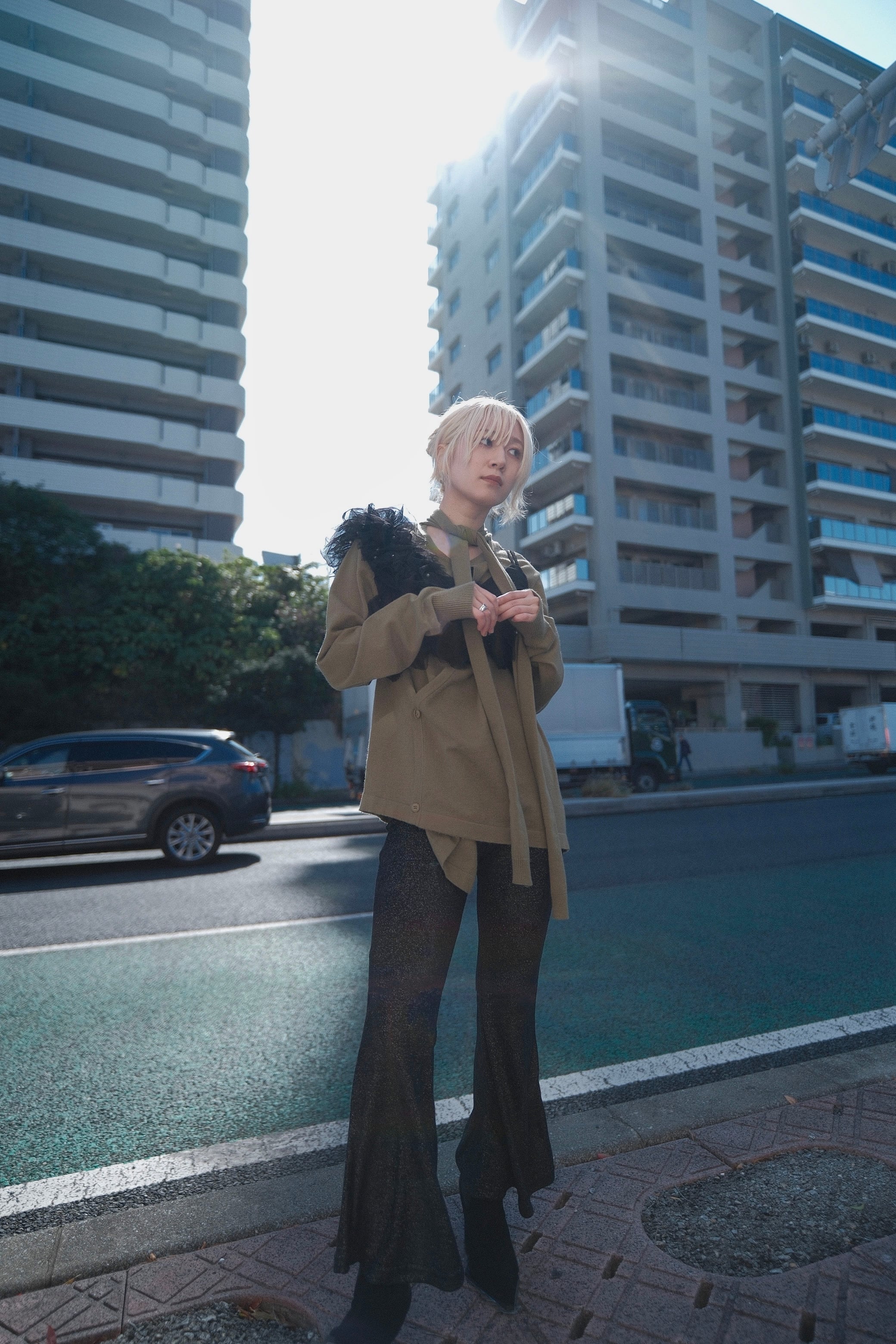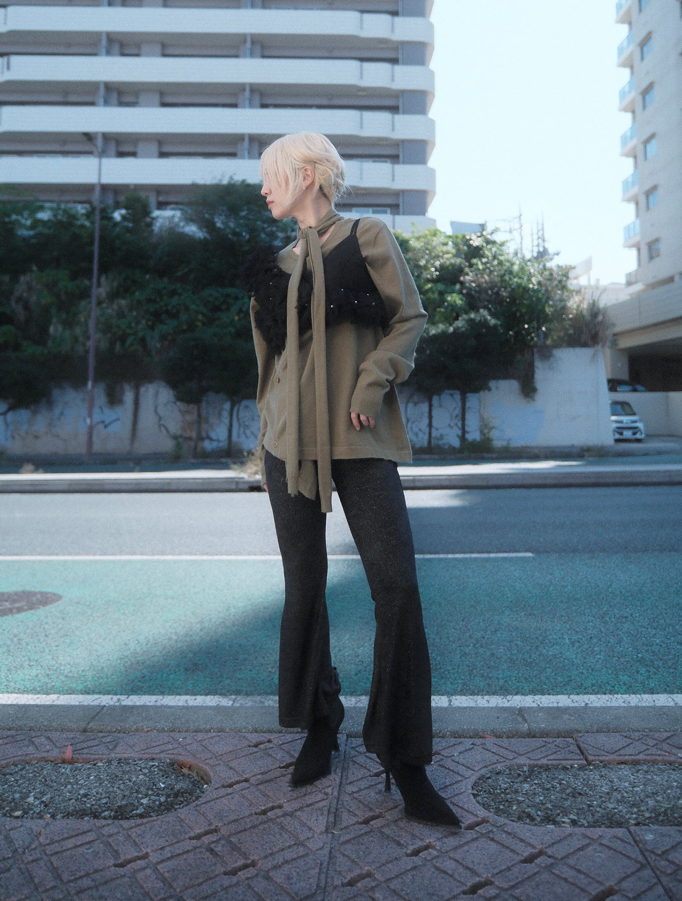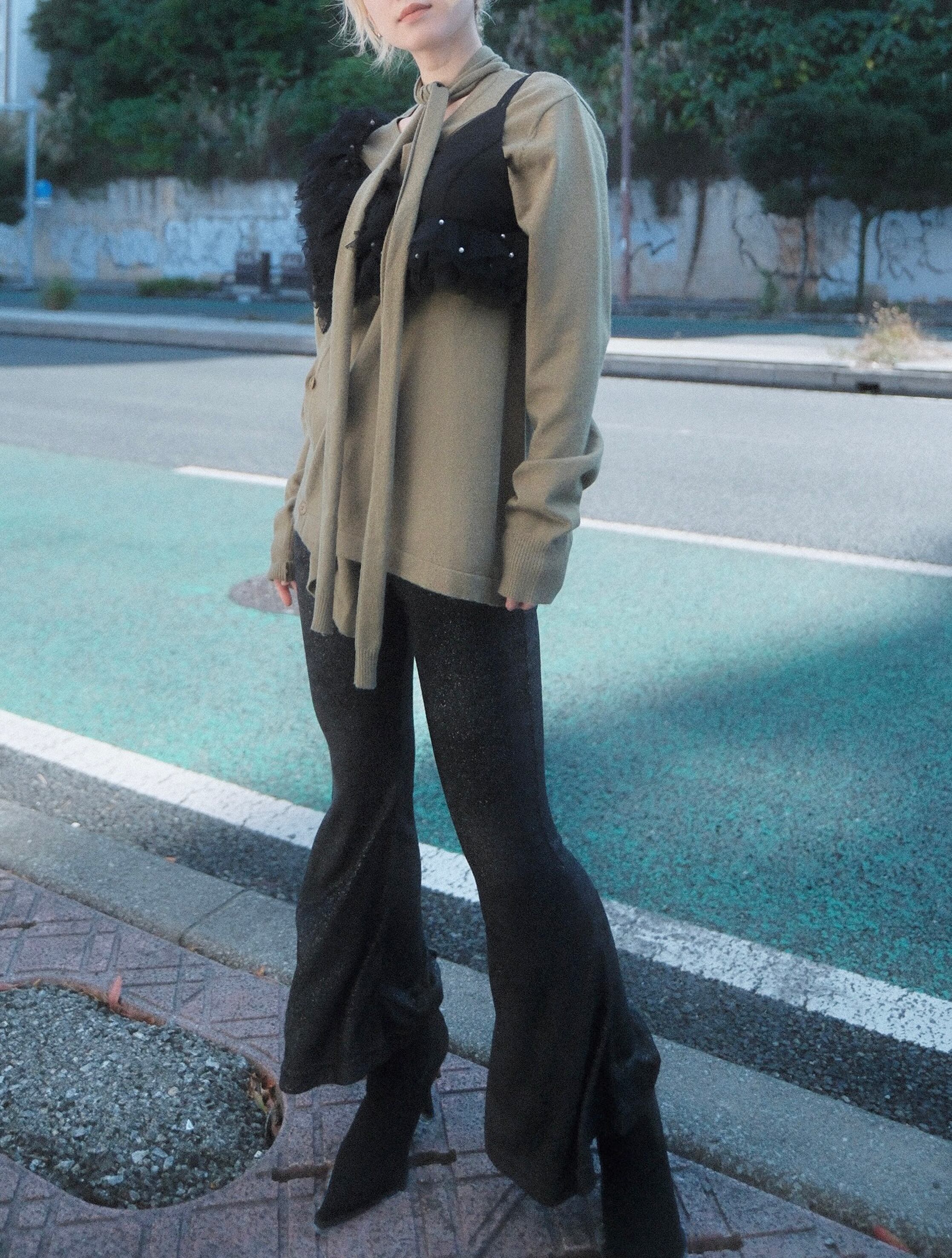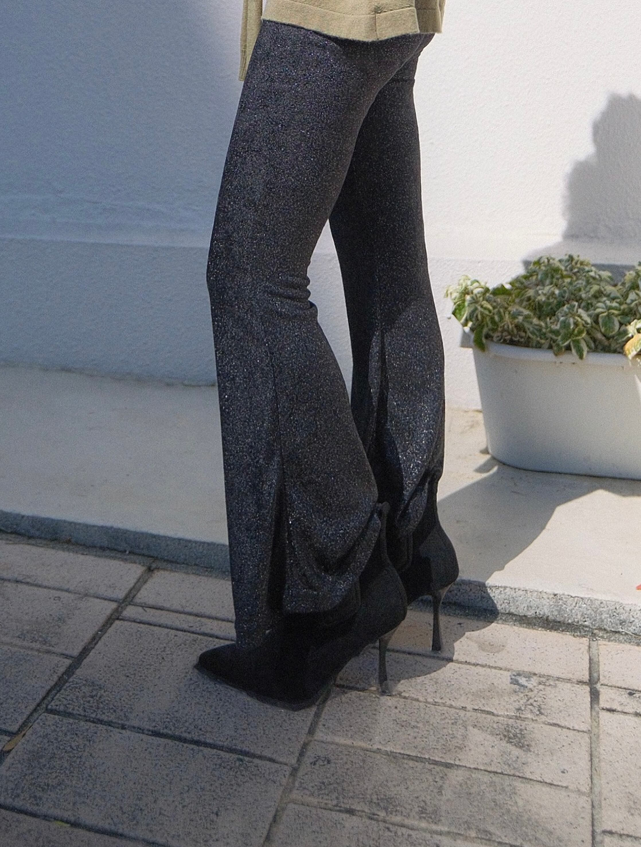 ストレスフリーな伸縮性に加え、ラメ入りのベロア素材がコーディネートに華やかなスパイスを与えます。