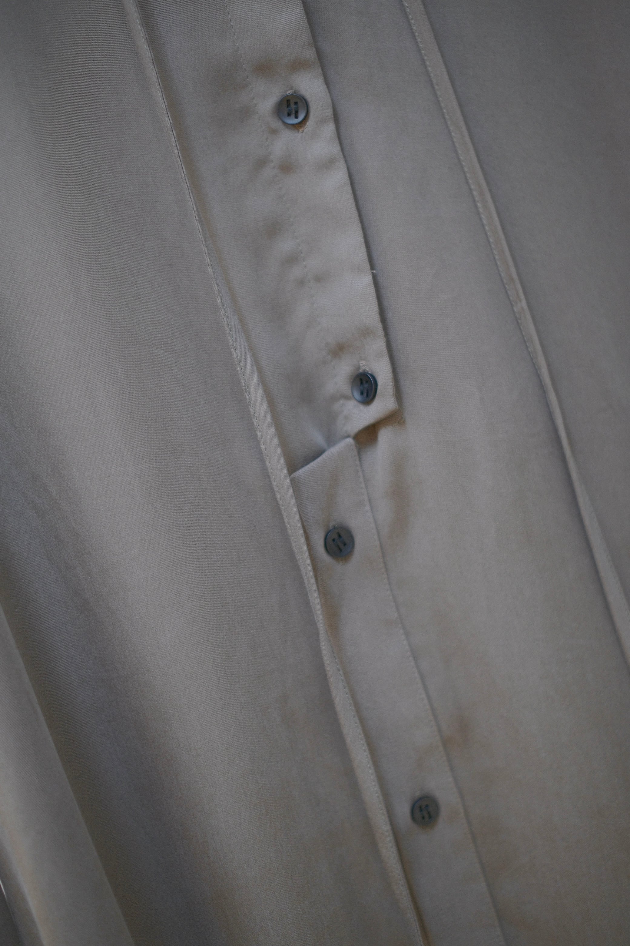 襟元のタックデザインや、フロントの変形ボタン仕様、サイドにはスリットを取り入れています。