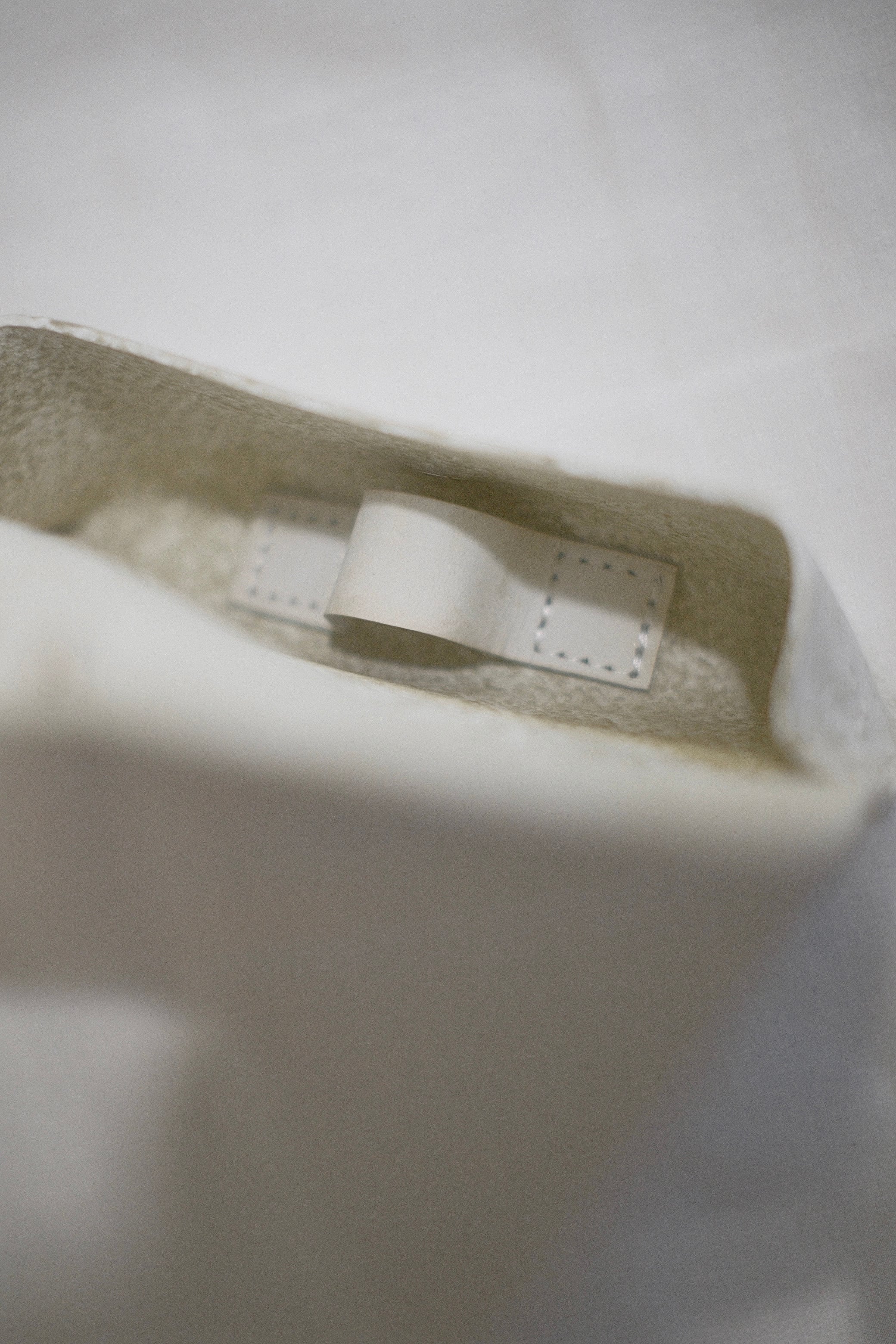 本革の上からパテ加工を施し、壁の質感を再現したバッグや小物を製作。