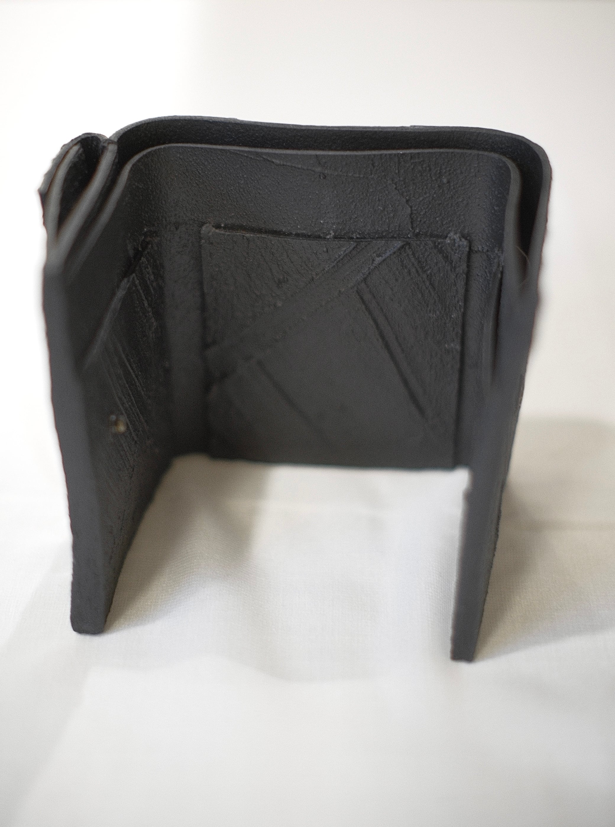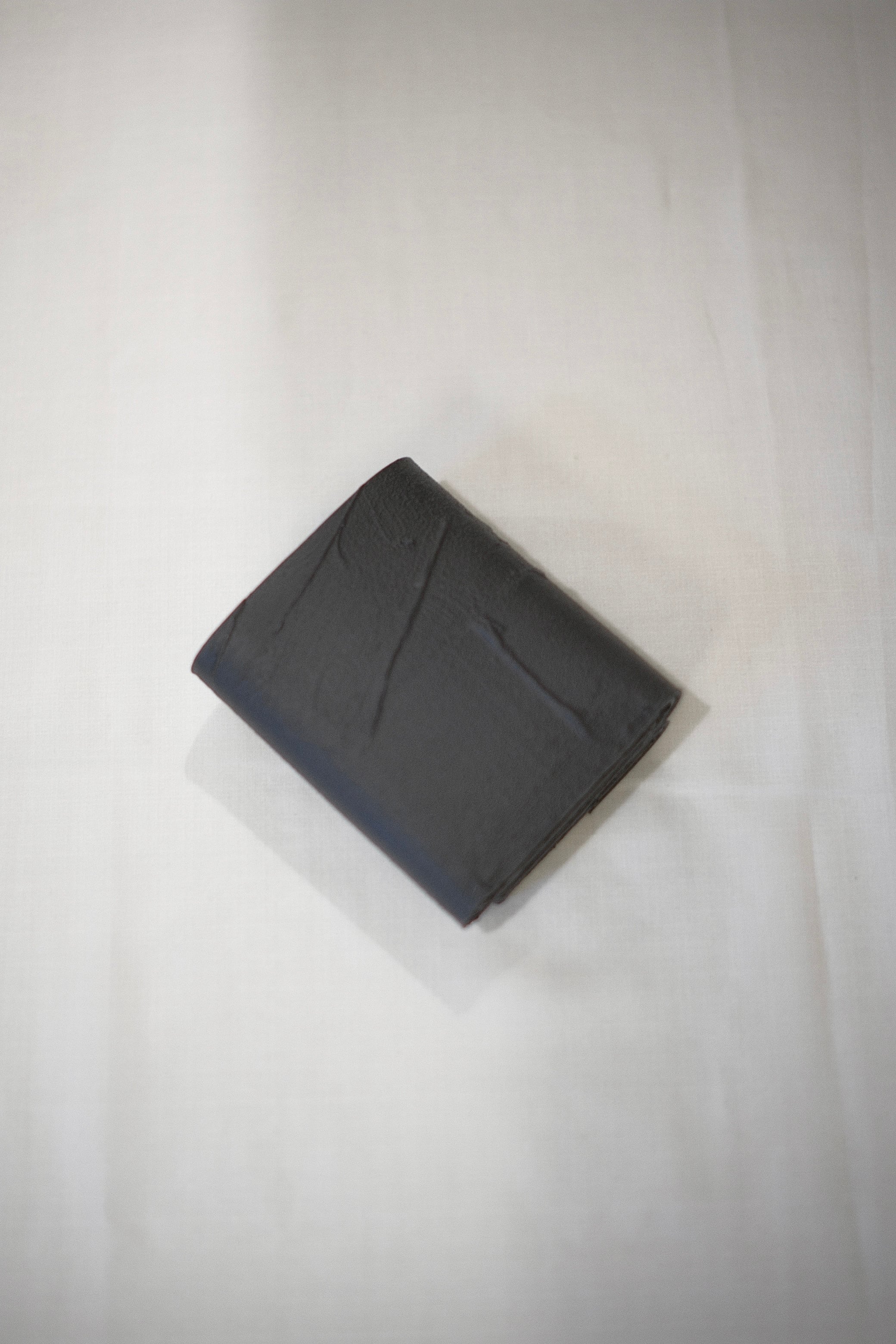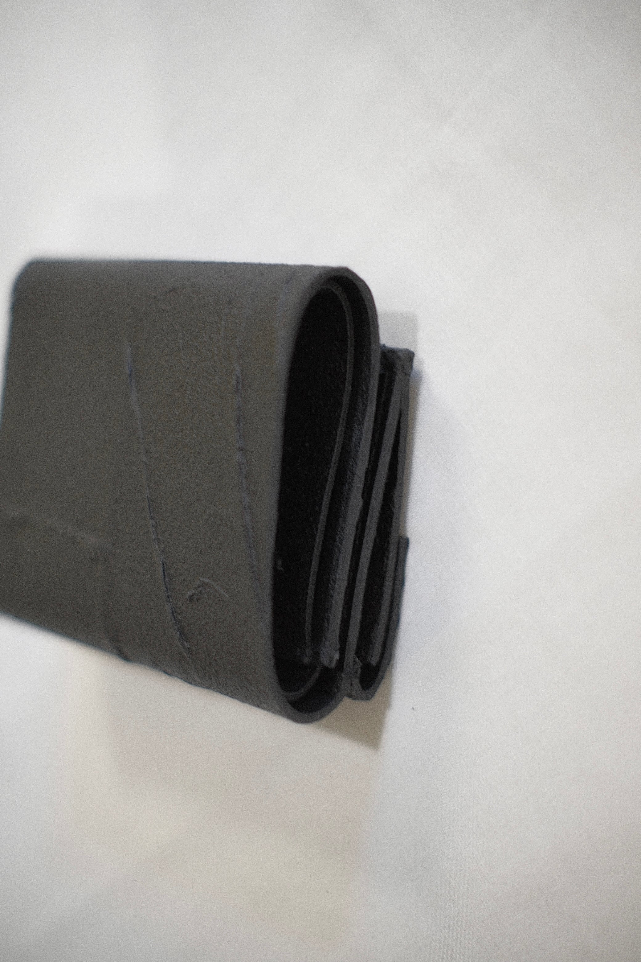 本革の上に建築材のパテを施し、壁の質感を再現した三つ折りのレザーウォレット。