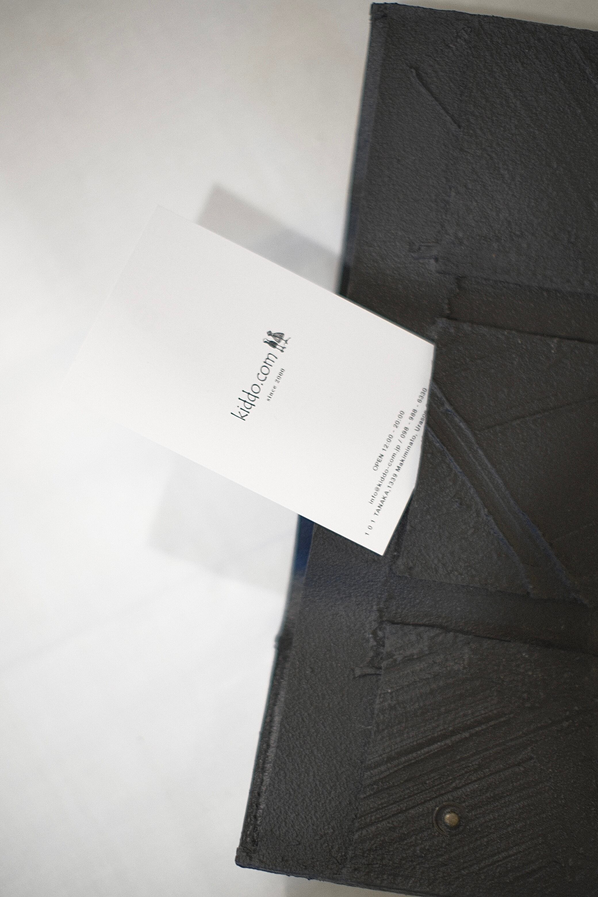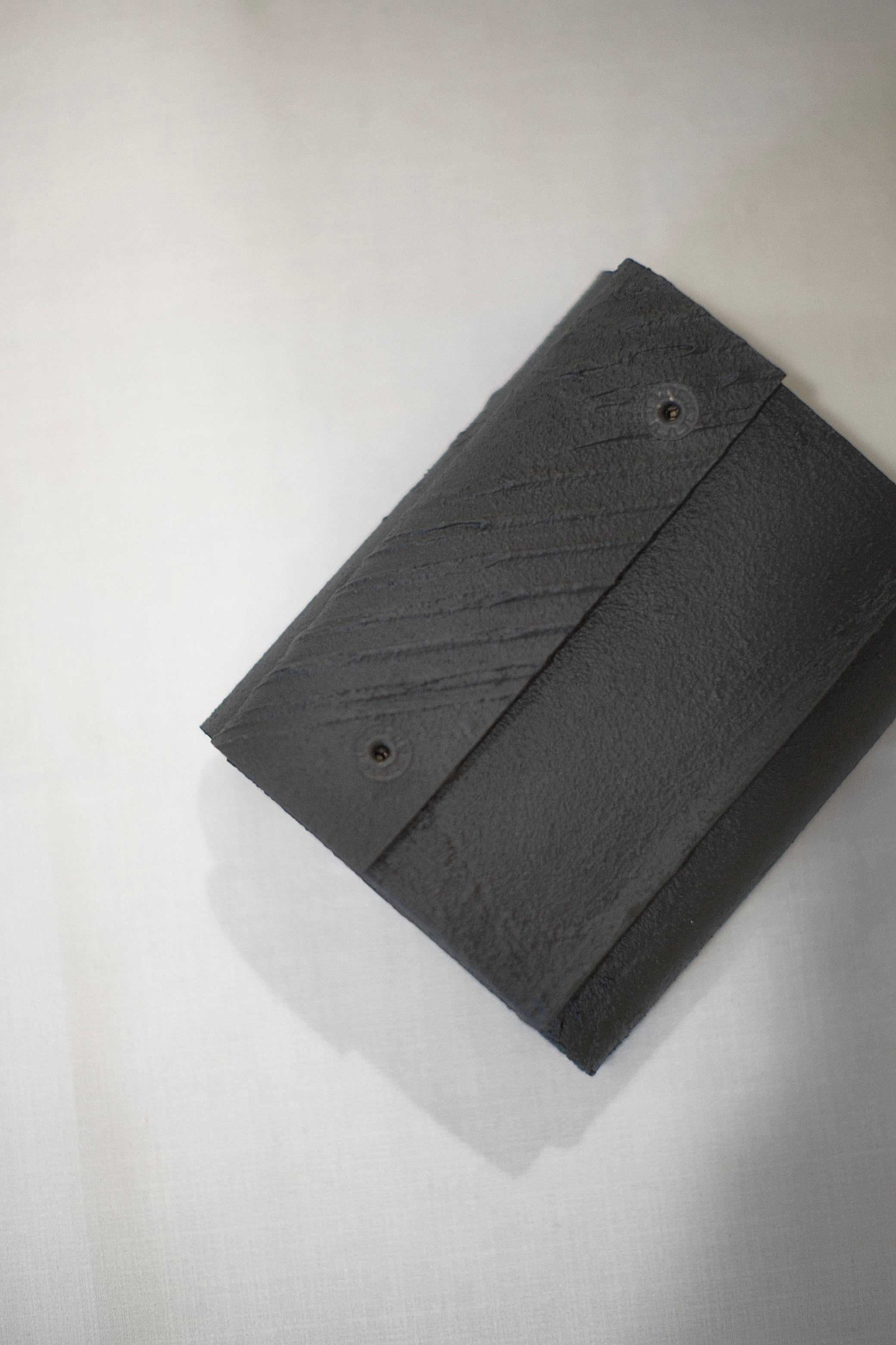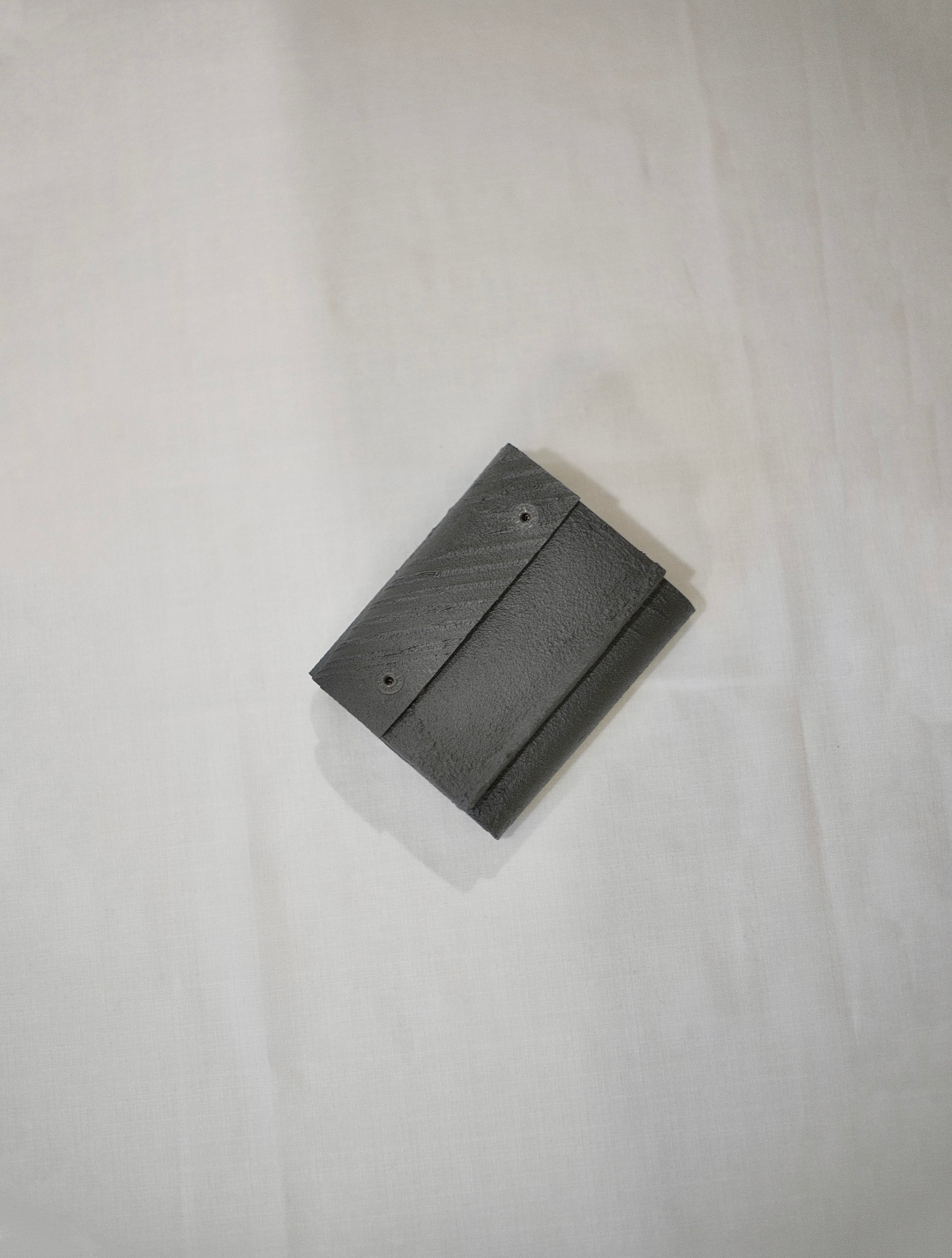 本革の上に建築材のパテを施し、壁の質感を再現した三つ折りのレザーウォレット。