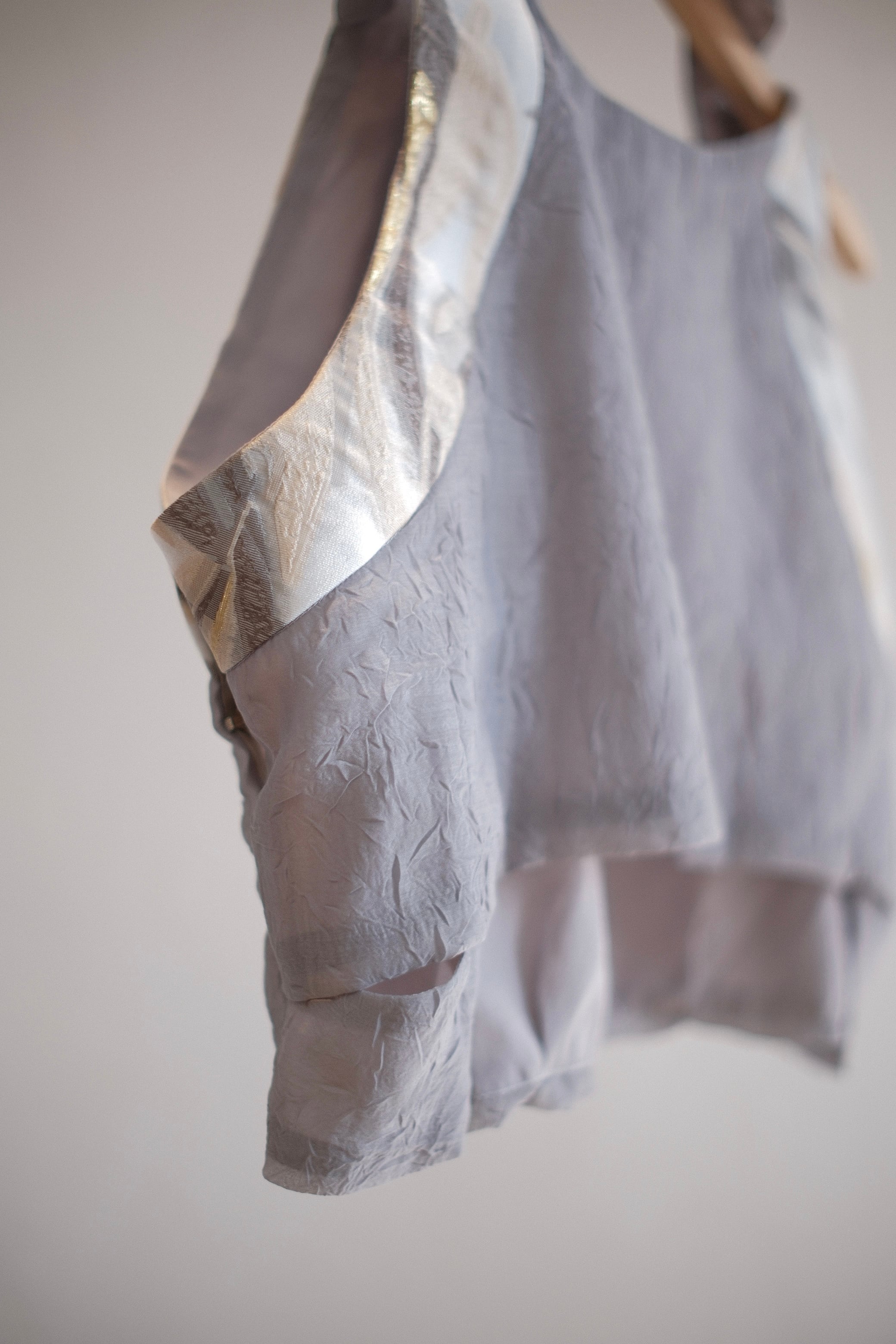 やわらかな光沢感のある上質な生地を組み合わせたトップス。