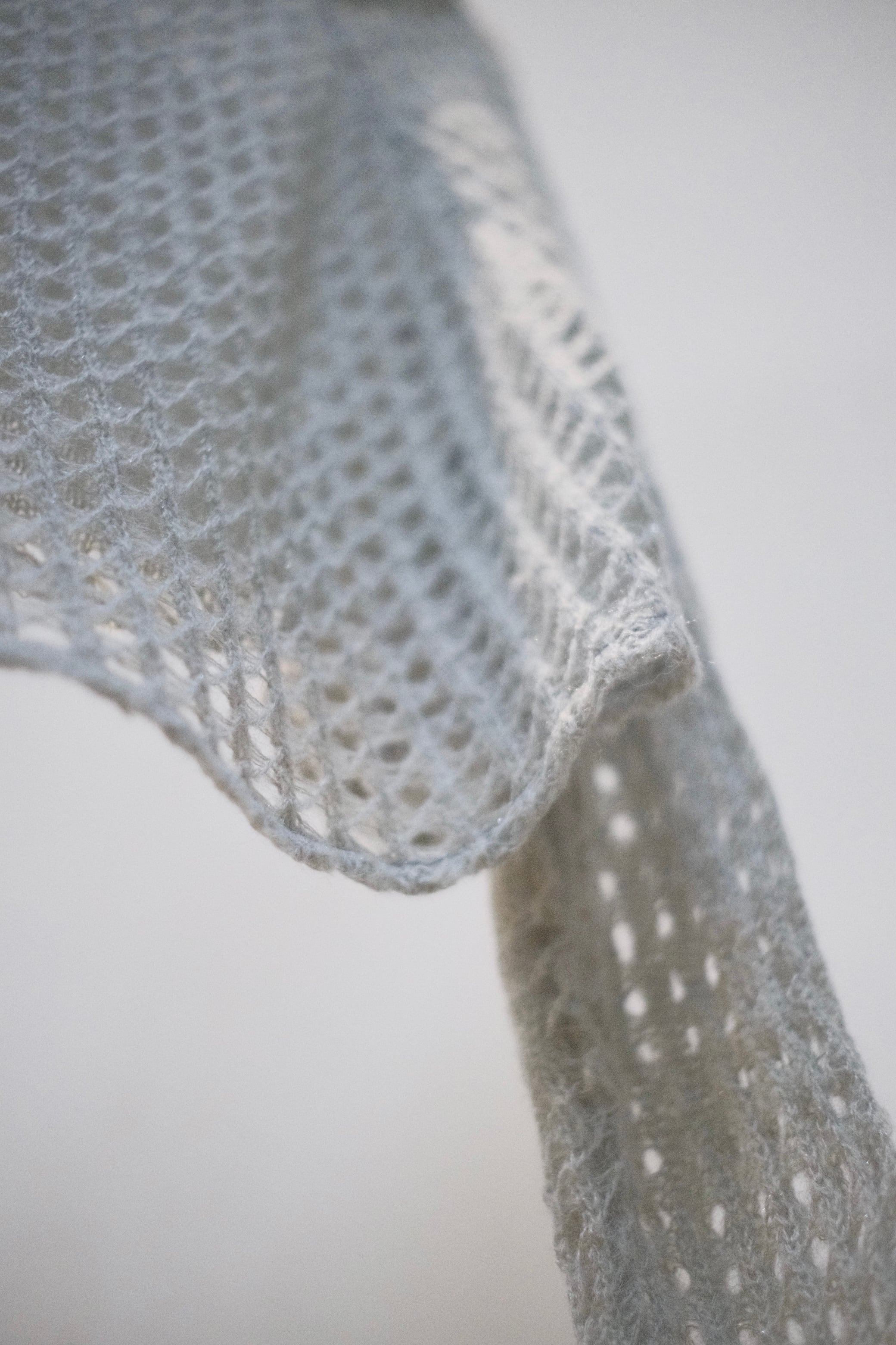 光沢感を抑えたやわらかなラメ糸を取り入れたメッシュ編みのニットトップス。