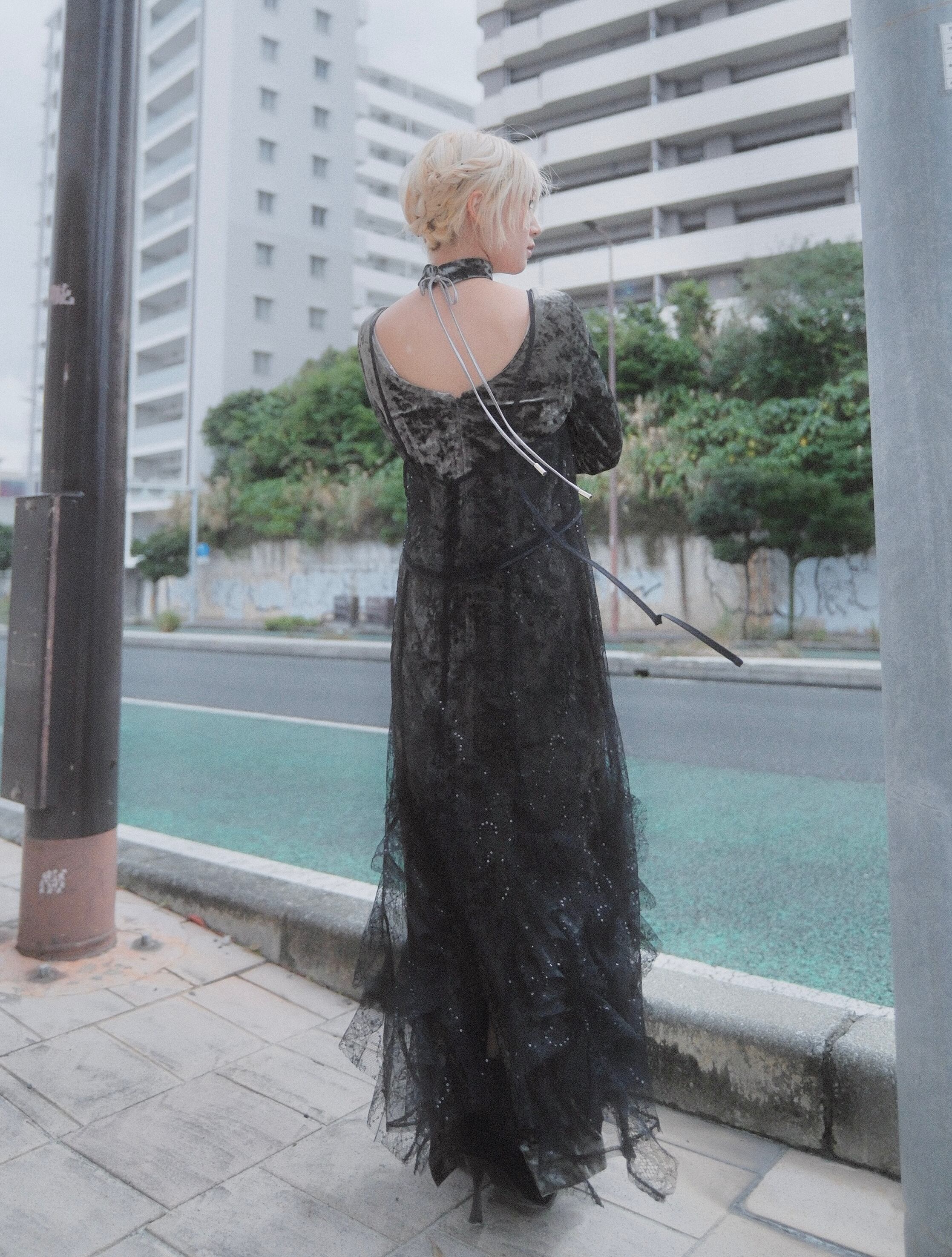 ワンピースには、毛並みを不揃いに加工した、光沢とドレープ性が特徴のベロア生地で、