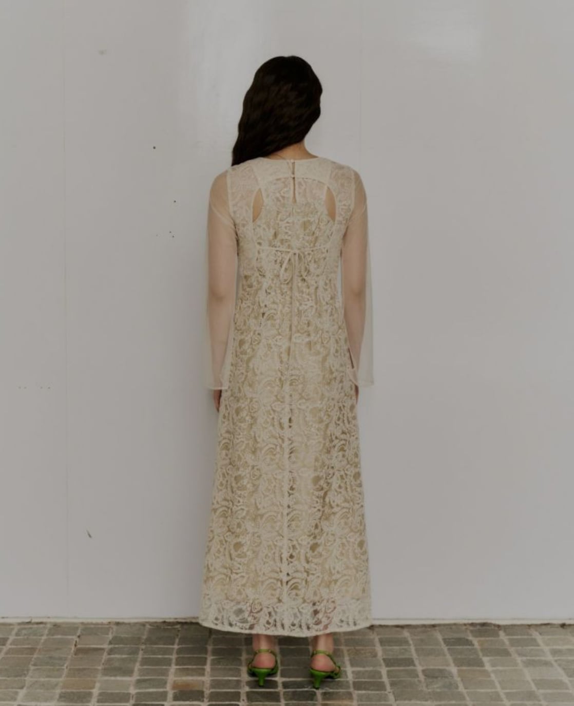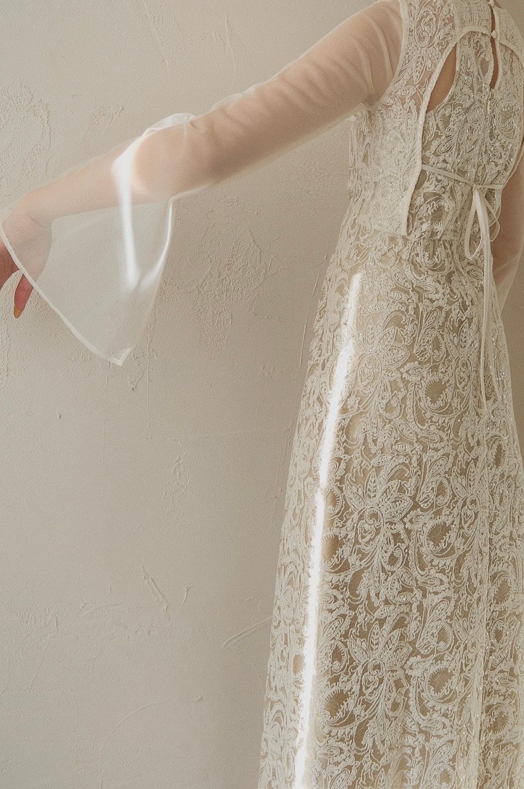 レイヤード風のバックスタイルが目を引く華やかな刺繍ドレス。
