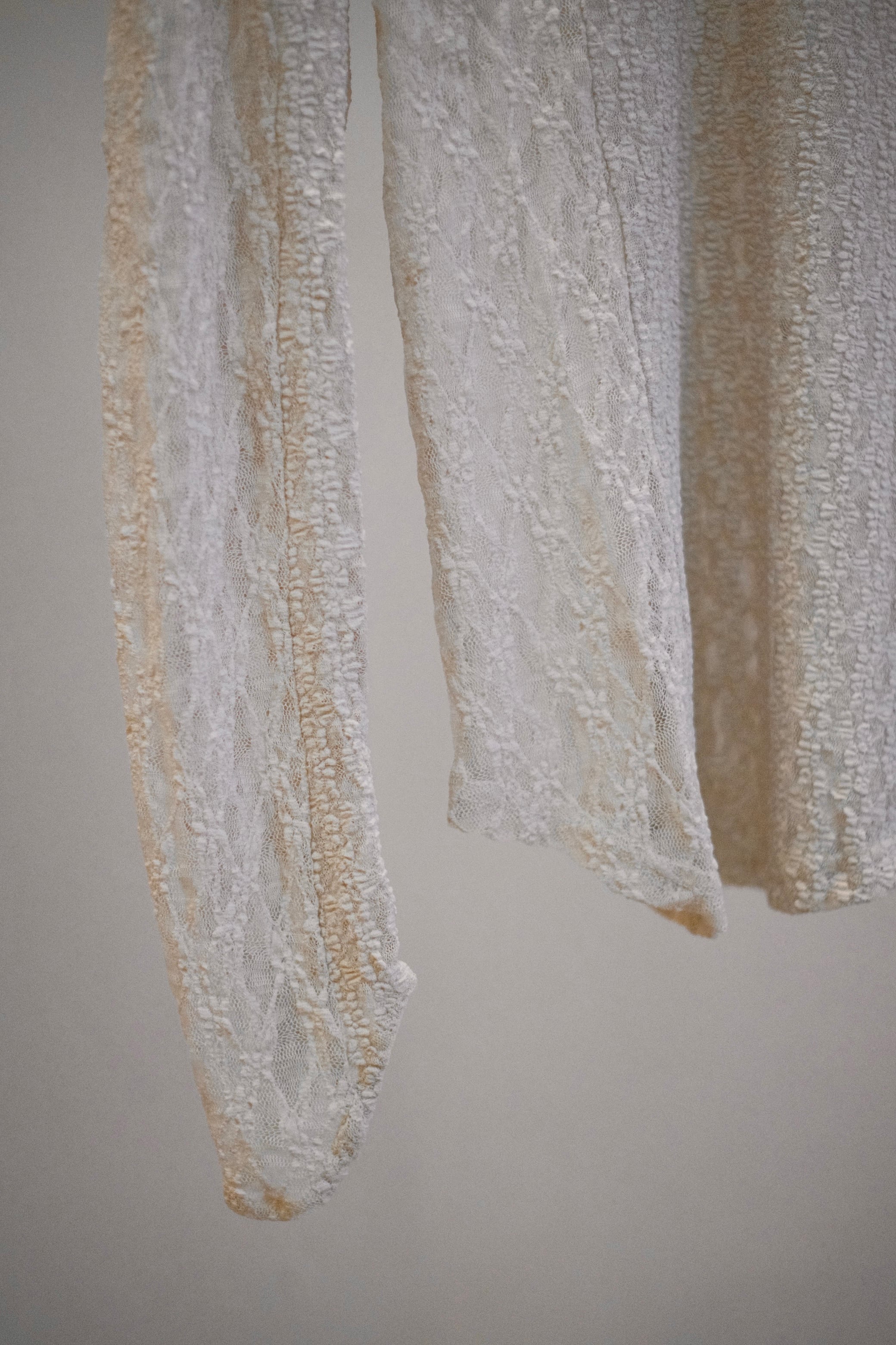 異なる柄の2種類のレースを組み合わせた、周りと差がつくブロッキングデザインのトップス。