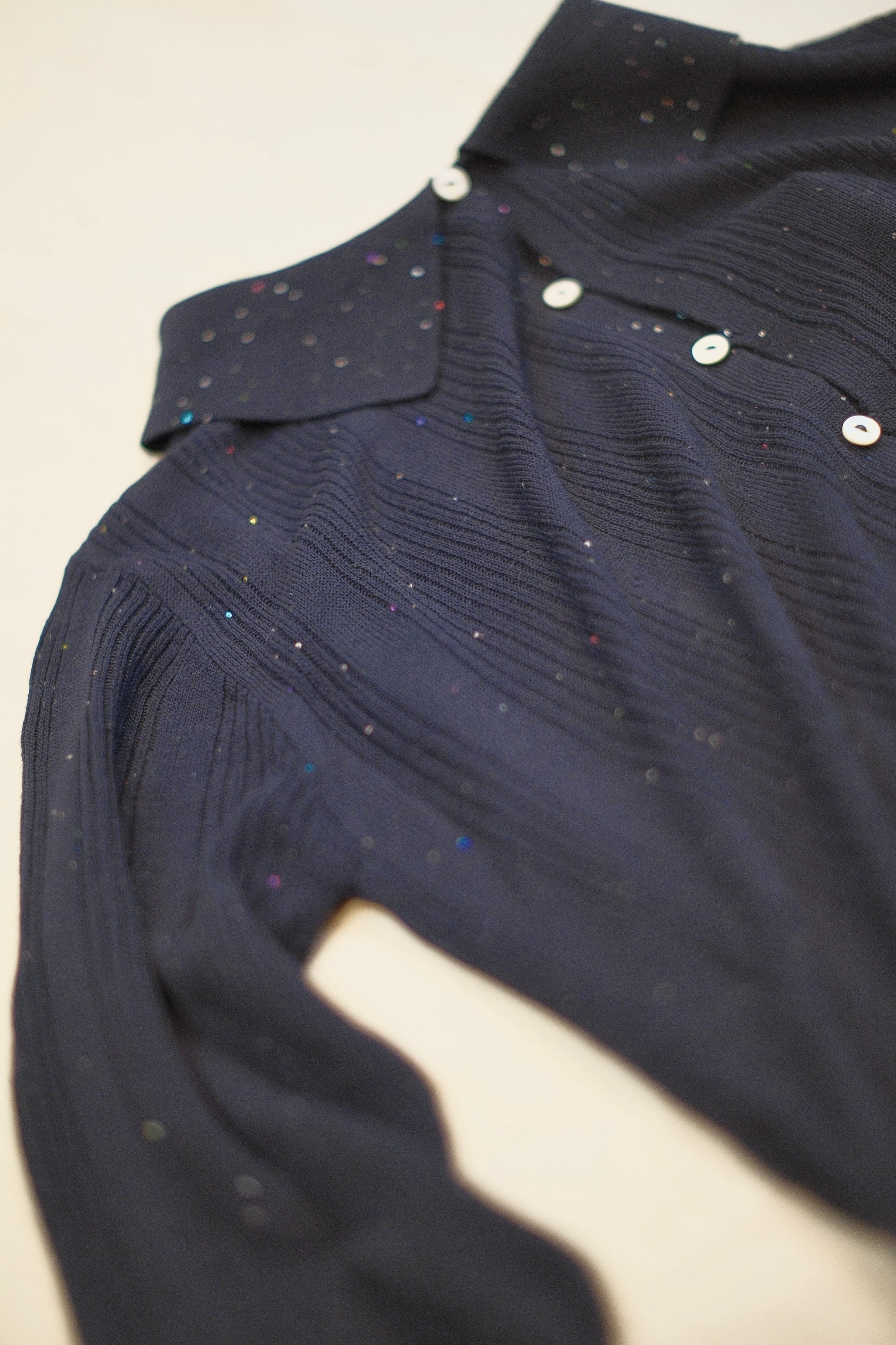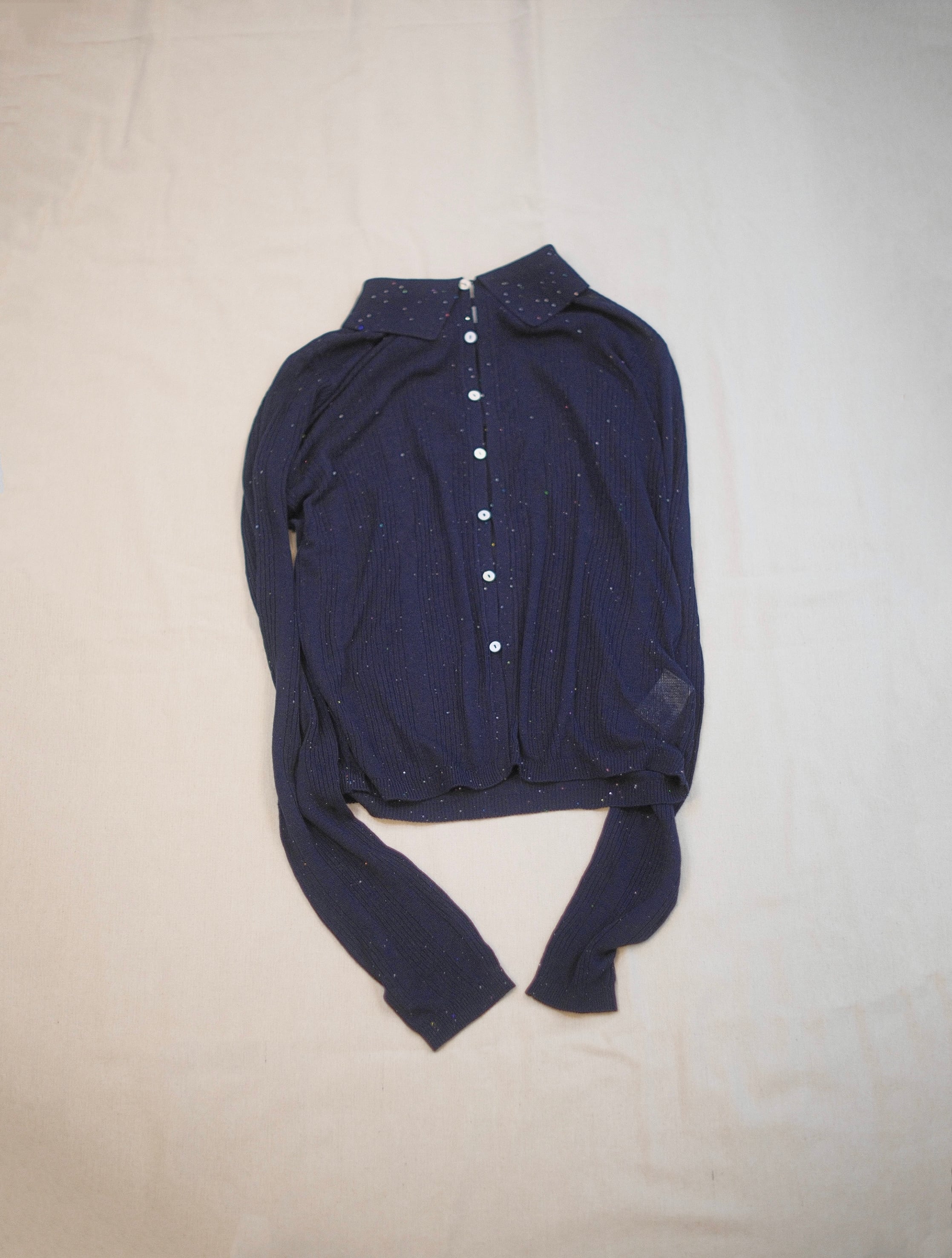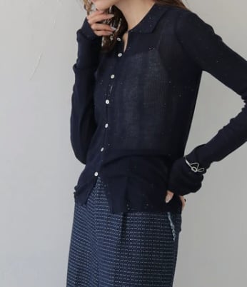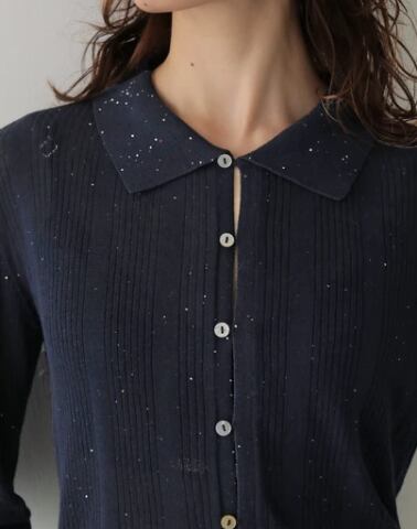 Random Rib Sequin Sheer Polo Knit Shirts / NAVY